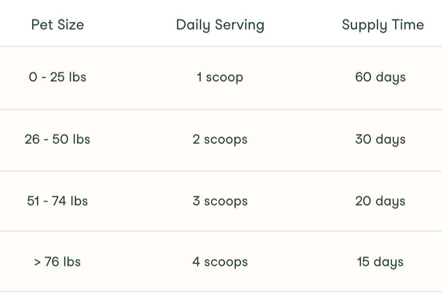 Each tub contains roughly 60 servings, enough for 1–2 months depending on your dog’s size: